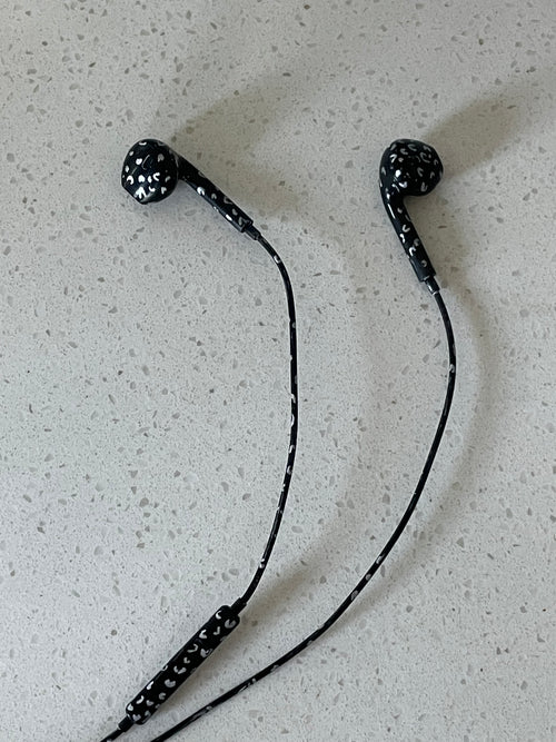 black and silver cheetah print earbuds